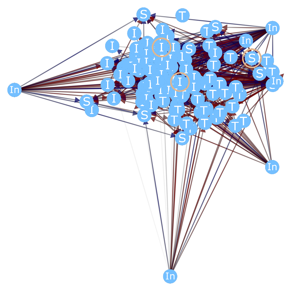 So, we start by computing sums, which is the integration of each node’s inputs. Then, we apply the activation function to get activations, in this case a simply linear rectifier (max(0, value)).